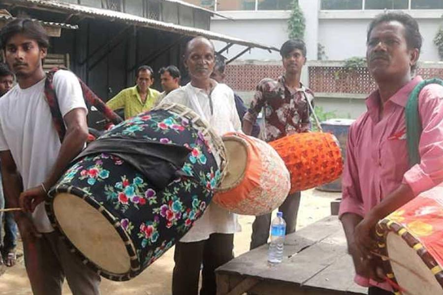 ঢাকের হাটে দেখা হয়ে গেল বাজিতপুরের অজিত দাসের সঙ্গে। এক ঢাকির সঙ্গে ১৪ হাজার টাকায় চুক্তি করেছেন তিনি। বললেন, ‘‘সবার বাজনা শুনেছি। যেটা মন ছুঁয়েছে, তাকেই নিয়েছি।’’ নেত্রকোনার বারহাট্টা থেকে রিপন কর্মকার ও সুনীল রবিদাস এসেছেন তাঁদের পুজোয় বাদক দল নেবেন বলে। তাঁদের কথায়, ‘‘এই প্রথম ঢাকের হাটে এসেছি। খুব ভালো লাগছে। চেষ্টা করছি সাধ্যের মধ্যে ভালো একটা দল নিতে।’’ এ হাটে একজনের ঢাকি যেমন আছে, তেমনি দলগত বাজনার দলও রয়েছে। একজন ঢাকীর পারিশ্রমিক ১৪-১৫ হাজার টাকা। দলের ক্ষেত্রে তা ৫০ হাজার থেকে দেড়-দু’লক্ষ টাকা পর্যন্ত চড়ে। বিক্রমপুরের পরিমল দাস বললেন, ”২০ বছর ধরে এখানে আসছি। ফোনে চুক্তি করলেও পারতাম, কিন্তু ঢাকের হাটে না এলে মন ভরে না।’’ তবে তাঁর অভিযোগ, ‘‘আমরা এদিনটির জন্য অপেক্ষা করি। বাজারে সবকিছুর দাম বেশি। খাটাখাটনির তুলনায় পারিশ্রমিক পাওয়া যায় না। তবু পূর্বপুরুষের পেশা ধরে রেখেছি। আগে বাপ-দাদারা আসতেন, এখন আমি আসি।’’