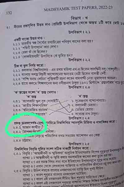 মাধ্যমিকের টেস্ট পেপারের ১৩২ নম্বর পৃষ্ঠায় একটি প্রশ্নের উত্তরের চারটি অপশনের মধ্যে ‘আজাদ কাশ্মীর’ শব্দটি লেখা হয়েছে। আর তা নিয়েই শুরু হয়েছে বিতর্ক। মাধ্যমিকের টেস্ট পেপারের ১৩২ নম্বর পৃষ্ঠায় বিভাগ ‘খ’-এর উপ-বিভাগ ২.৪-এর প্রথম প্রশ্নটি হল, প্রদত্ত ভারতবর্ষের রেখা মানচিত্রে নিম্নলিখিত স্থানগুলো চিহ্নিত বা নামাঙ্কিত কর। প্রশ্নের ৪টি উত্তরের প্রথমটিতে উত্তর হিসাবে ‘আজাদ কাশ্মীর’ বলা হয়েছে। সরকারি টেস্ট পেপারে কেন এই বিতর্কিত ‘আজাদ কাশ্মীরে’র উল্লেখ? এনিয়েই শোরগোল পড়ে যায় মধ্যশিক্ষা পর্ষদে।