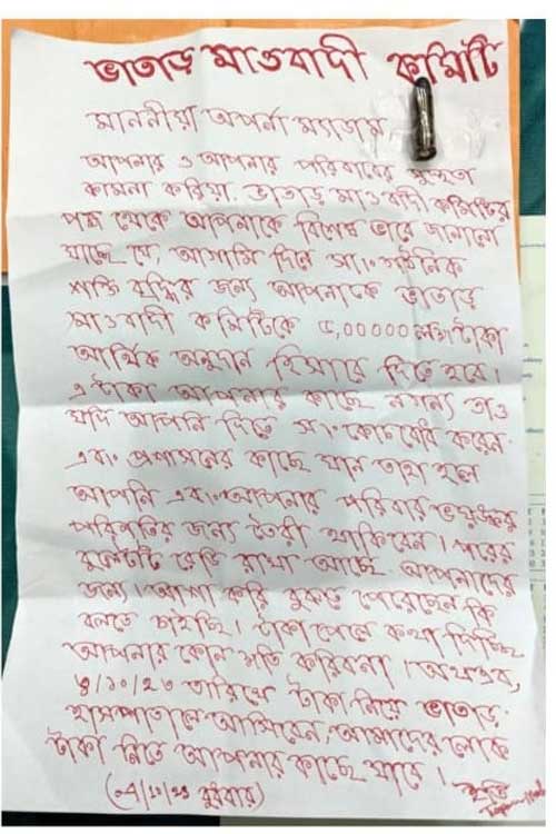 জানা গিয়েছে, অপর্ণা মুখোপাধ্যায় নামে ভাতার ব্লক হাসপাতালের ওই চিকিৎসক দন্ত বিশেষজ্ঞ (Dentist)। তিনি মঙ্গলবার দন্ত বিভাগ ঢুকে আউটডোর খোলার সময় মেঝেতে একটি চিঠি পড়ে থাকতে দেখেন। ওই চিঠির সঙ্গে একটি কার্তুজও সেলোটেপ দিয়ে আঁটা ছিল বলে তিনি জানান। চিঠিটি মাওবাদীদের নাম করে লেখা। পাঁচ লক্ষ টাকা দাবি করা হয়েছে। ওই টাকা বুধবারের মধ্যে দিতে হবে বলে স্পষ্ট হুমকি। চিকিৎসক অপর্ণা মুখোপাধ্যায় সঙ্গে সঙ্গে বিষয়টি ব্লক স্বাস্থ্য আধিকারিককে (BMOH) জানান।