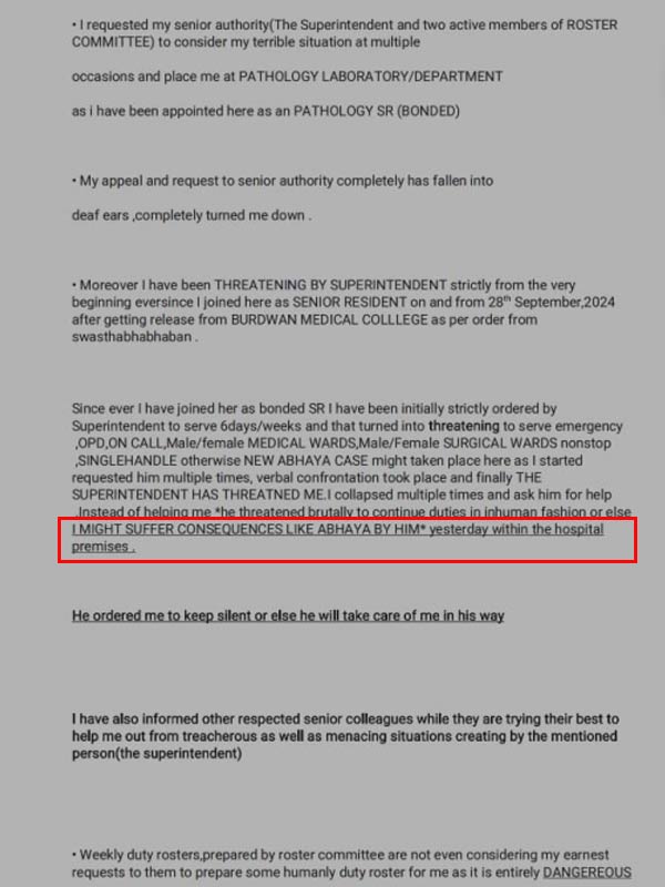 ঘটনা অনেকটা এরকম। মাস খানেক আগে বর্ধমান মেডিক্যাল কলেজ হাসপাতাল থেকে শান্তিপুর স্টেট জেনারেল হাসপাতালে স্থানান্তরিত হয়ে আসেন এক মহিলা চিকিৎসক। তিনি প্যাথোলজি বিভাগে কর্মরত। সূত্রের খবর, তাঁর সঙ্গে ডিউটি সংক্রান্ত বিষয়ে মতানৈক্য চলছিল শান্তিপুর স্টেট জেনারেল হাসপাতালের সুপারের। তাঁর অভিযোগ, প্যাথোলজি বিভাগের বদলে তাঁকে রোজ আউটডোর, ইনডোর ও এমারজেন্সি বিভাগে ডিউটি দেওয়া হচ্ছে। সেখানে কোনও কোনও সংকটজনক রোগীর চিকিৎসা করতে সমস্যার মুখে পড়ছেন তিনি। সেকথা হাসপাতালের সুপারকে জানিয়েছিলেন। অনুরোধ করেছিলেন, এত ঘন ঘন এমারজেন্সিতে ডিউটি না দিয়ে প্যাথোলজি বিভাগেও কাজ করার সুযোগ করে দিতে। এনিয়ে চিকিৎসকের সঙ্গে সুপারের মতান্তর হয়। অভিযোগ, সেই বিবাদের সময় সুপার মহিলা চিকিৎসককে হুমকির সুরে জানান, তাঁর কথা না মানলে ‘দ্বিতীয় অভয়া’ কাণ্ড ঘটে যাবে।