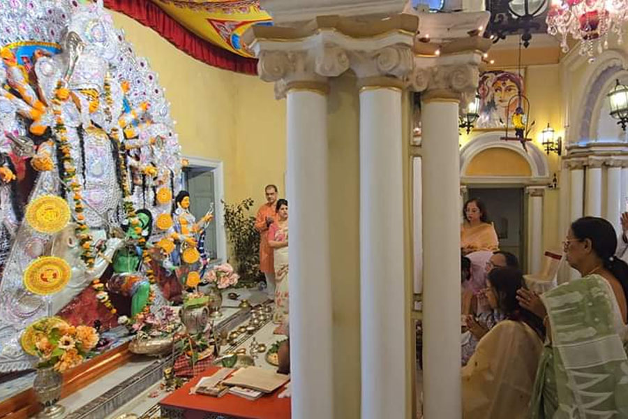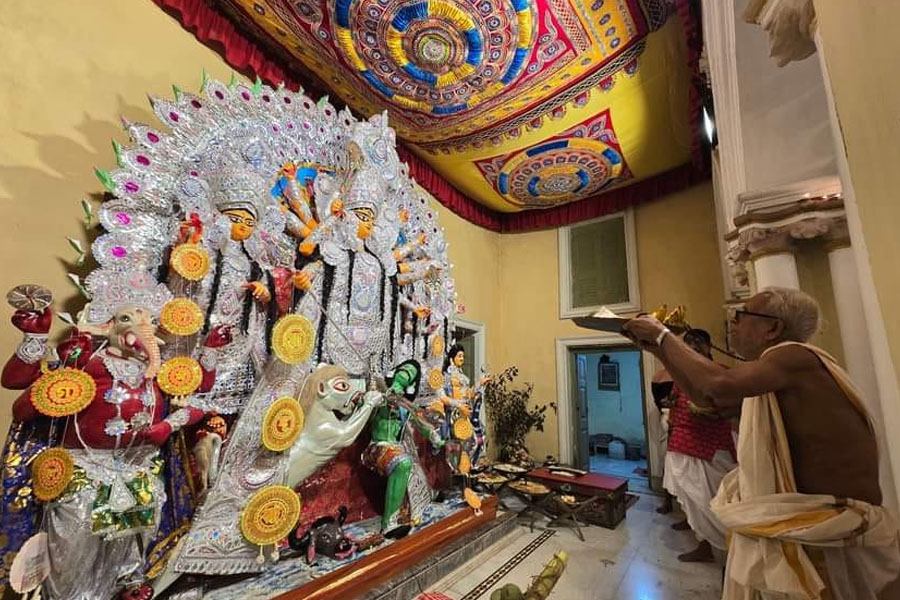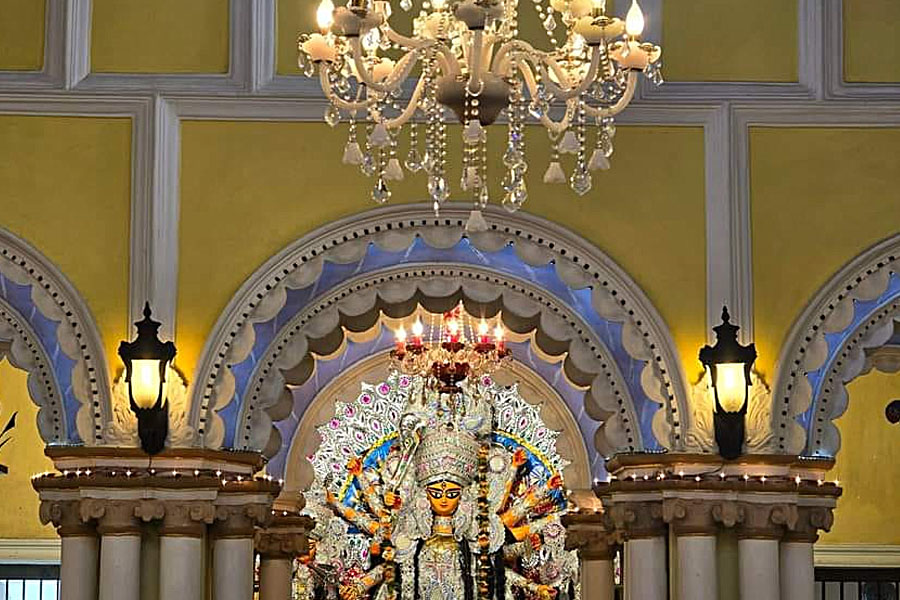 এবার আসা যাক কাশিমবাজার রাজবাড়ির দুর্গাপুজোর কথায়। কিন্তু তার আগে প্রশ্নের শেষ নেই। রাজবাড়ি কেন? নানান সমাজসেবামূলক কাজের স্বীকৃতি স্বরূপ এই ‘রাজা’ উপাধি ভাইসরয় কর্তৃক প্রদত্ত। রায়বাড়ির সদস্যরা তিন পুরুষ ধরে রাজা সম্মান পেয়েছেন। ১৯৩৮-এ কমলারঞ্জন রায় রাজা উপাধি পেয়েছিলেন। পল্লববাবু জানালেন, রথের দিন কাঠামো পুজো হয়। একে বলা হয় শ্রীপাট পুজো। ওই দিনই প্রতিমায় পড়ে মাটির প্রলেপ। প্রথমে পাটপুজো, তারপর রথপুজো এবং রথটানা। তারপর মৃত্তিকার কাঠামোয় মাটি। এটাই রীতি। পুরোহিত মাটিকে মন্ত্রপূত করে পবিত্র করেন। সেই মাটি দিয়েই মৃন্ময়ী রূপ পান দেবী। বংশানুক্রমে এটাই হয়ে আসছে। অনন্ত চতুর্দশীর দিন প্রতিমায় সাদা রং করা হয়। মহালয়ার পরের দিন অর্থাৎ প্রতিপদে কাটিগঙ্গা থেকে (কাশিমবাজারে এখন যাতে কাটিগঙ্গা বলা হয়, সেটাই এক সময় বহতা গঙ্গা ছিল) জল নিয়ে আসা হয় ঘটে করে। সেই ঘট নির্মিত প্রতিমার সামনে স্থাপন করা হয়। দুর্গানাম জপ, চণ্ডীপাঠ সবই হয়। একটা কথা এই প্রসঙ্গে বলে রাখা ভালো, এই সময় কিন্তু বেদির উপরে স্থাপিত থাকলেও দেবীপ্রতিমার পুজো হয় না। পুজো হয় বিল্ববৃক্ষ ডাল বা বেল গাছের ডাল। যা থাকে চণ্ডীমণ্ডপের এক কোনায়। এরপর বোধন, ষষ্ঠীতে আমন্ত্রণ, অধিবাস এগুলো হয়ে থাকে। সপ্তমীর দিন দ্বিতীয় বার কাটিগঙ্গা থেকে মিছিল করে জল নিয়ে আসা হয়। কলাবউ স্থান হয়। এরপর শুরু সপ্তমী পুজো। বাকি দিনগুলোতেও প্রথা মেনে পুজো হয়। কুমারী পুজোও হয়। কাশিমবাজার রাজবাড়িতে নবরাত্রি দুর্গাপুজোর রীতি। এ বাড়ির প্রতিমা এক চালচিত্রের। সিংহের রূপ হল ‘ঘোটক সিংহ’ (সিংহ এবং ঘোড়ার মিশ্রণ)। অর্থাৎ শক্তি এবং স্ফূর্তির প্রতীক। রীতি অনুযায়ী প্রত্যেকদিন কুমারী পুজো হয়।
