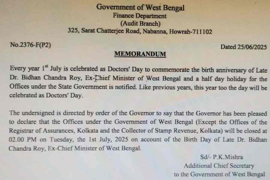 ১ জুলাই স্বনামধন্য চিকিৎসক তথা রাজ্যের প্রাক্তন মুখ্যমন্ত্রী ডা. বিধানচন্দ্র রায়ের জন্মবার্ষিকী। দেশজুড়ে ওই দিনটি চিকিৎসক দিবস হিসেবে পালিত হয়। সেই উপলক্ষে রাজ্য সরকারি কর্মচারীদের ‘হাফ ছুটি’র ঘোষণা। ওই দিন দুপুর দু’টোয় বন্ধ হয়ে যাবে রাজ্য সরকারি অফিস। যদিও কলকাতার রেজিস্ট্রার অফ অ্যাসিউরেন্স এবং কালেক্টর অফ স্ট্যাম্প রেভিনিউ-এর অফিস খোলা থাকবে।