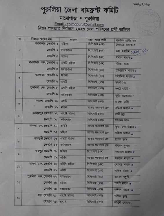 অন্যদিকে, পুরুলিয়াতেও (Purulia) একই ছবি। জেলা পরিষদের সমস্ত আসনে প্রার্থীদের নামের তালিকা ঘোষণা করা হয়েছে। শরিক দলগুলিকে সঙ্গে নিয়েই এই তালিকা প্রকাশিত হয়েছে।