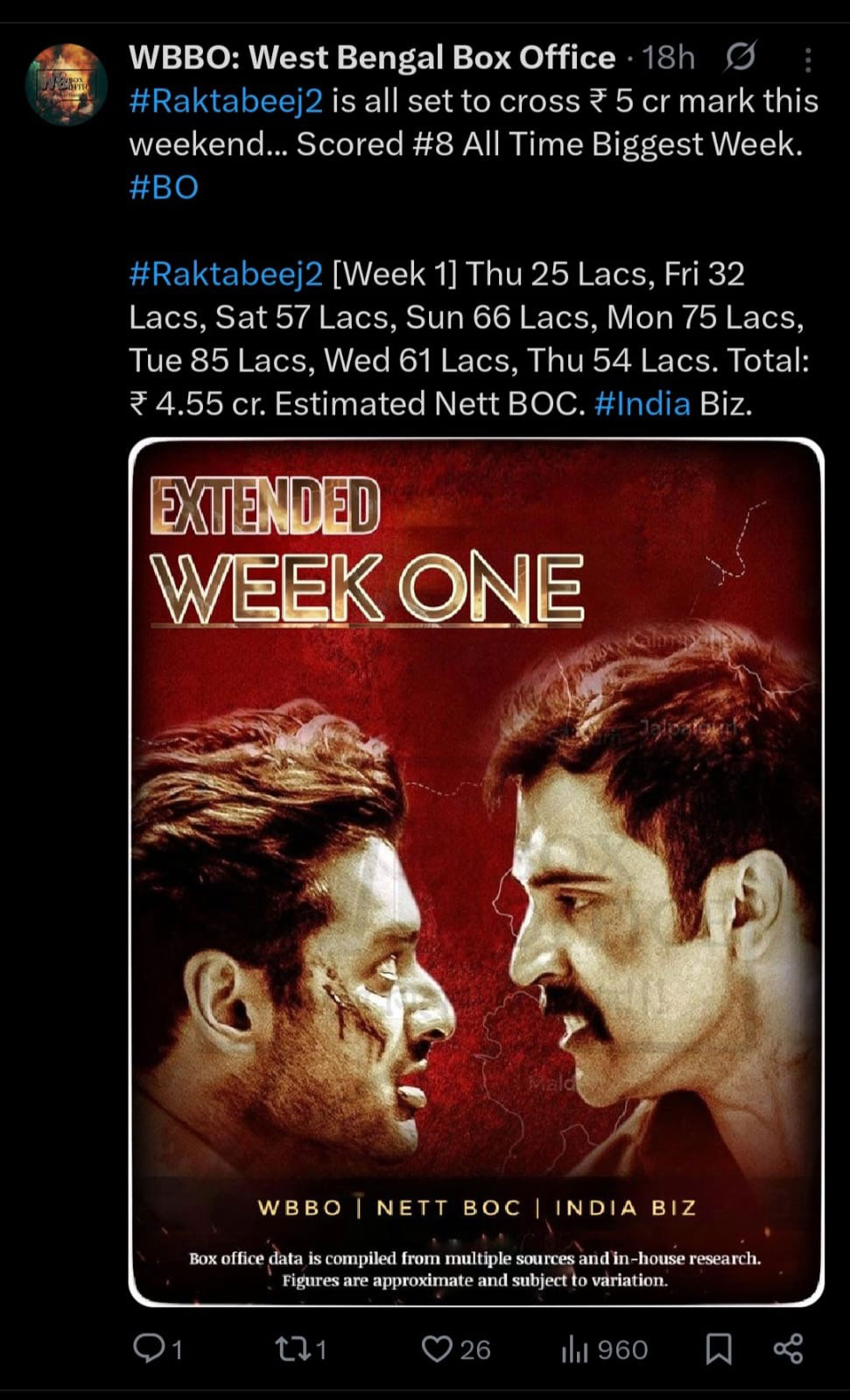 ওয়েস্ট বেঙ্গল বক্স অফিসের অফিসিয়াল সোশা?মিডিয়া পেজে প্রকাশ্য?এল ছবির প্রথ?সপ্তাহ?ব্যবসা?হিসেব। এবার প্রা?পাঁচ কোটি?ঘর ছুঁই ছুঁই সাফল্য এই ছবির?জানা যাচ্ছে প্রথ?সপ্তাহ?এই ছবির ব্যবসা হয়েছ?যথাক্রমে, বৃহস্পতিবা?২৫ লা? শুক্রবার ৩২ লা? শনিবার ৫৭ লা? রবিবার ৬৬ লা? সোমবার ৭৫ লা? মঙ্গলবার ৮৫ লা? বুধবার ৬১ লা??বৃহস্পতিবা?৫৪ লা?টাকা?এই প্রথ?সপ্তাহ?সব মিলিয়ে ব্যাবসার নিরিখে এই ছবির বক্স অফিস কালেকশ??৫৫ কোটি টাকা?অর্থাৎ পাঁচ কোটি?ব্যবসা থেকে সামান্?দূরে রয়েছ?এই ছবি। তব?দর্শ?যেভাবে এই ছবিক?ভালোবাসা?ভরিয়?দিয়েছে তাতে পাঁচ কোটি?ঘর?প্রবেশ কর?থেকে খু?বেশি দূরে?নে?শিবু-নন্দিতার ছব?‘রক্তবী??#8217;?/p>