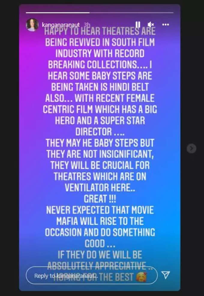 ইনস্টাগ্রাম স্টোরিতে কঙ্গনা লিখলেন, ”দক্ষিণ ভারতে সিনেমা হল নতুন উদ্যমে খুলেছে। বক্স অফিসেও দারুণ ব্যবসা শুরু। জানতে পেরেছি বলিউডেও বেবি স্টেপ নিচ্ছেন অনেকেই। সম্প্রতি নারী কেন্দ্রিক যে ছবি রিলিজ করেছে সুপারস্টার পরিচালক এবং নামজাদা হিরোর সেটিও হলেই মুক্তি পেয়েছে। এগুলি ছোট পদক্ষেপ। কিন্তু এই পদক্ষেপ খুবই গুরুত্বপূর্ণ। ভেন্টিলেশনে থাকা থিয়েটারগুলি ফের প্রাণ ফিরে পাবে।”