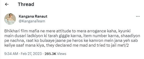 কঙ্গনার কথায়, ”আসলে আমি তো অন্য হিরোইনদের মতো হিরোইদের সঙ্গে রাত কাটাইনি তাই এসব আমাকে সহ্য করতে হয়েছে।”