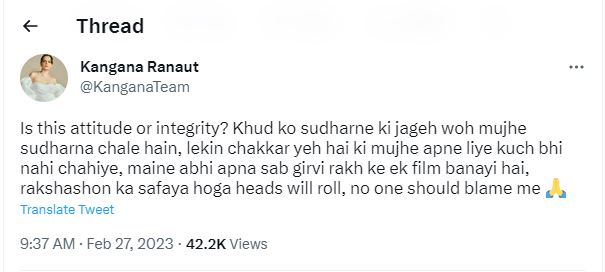 ব্যাপারটা একটু খোলসা করে বলা যাক। হঠাৎ করেই কঙ্গনার এক অনুরাগী কঙ্গনাকে প্রশ্ন করে বসেন, আপনি বলিউডের নামকরা অভিনেত্রী, আপনার মা হিমাচলে চাষবাস করছেন! অনুরাগীর এই প্রশ্নের জবাব কঙ্গনা স্পষ্ট লেখেন। আমার মা শিক্ষিকা ছিলেন। এখন নিজের মতো করে অবসর কাটাচ্ছেন। তবে এসব কথার মাঝখানে হঠাৎ নাম না নিয়ে করণ জোহরের বিরুদ্ধে তোপ দাগেন কঙ্গনা। কঙ্গনা টুইট করে লেখেন, ”ভিখিরি ফিল্ম মাফিয়াদের মতো বিয়ে অনুষ্ঠানে আমাকে নাচতে হয়নি। ওঁরা আমাকে পাগল বলেছেন। আমার অ্যাটিটিউডকে অ্যারোগেনস বলে কটাক্ষ করেছেন তাঁরা। এমনকী, আমাকে জেলে পাঠানোর চেষ্টাও করেছেন। ‘