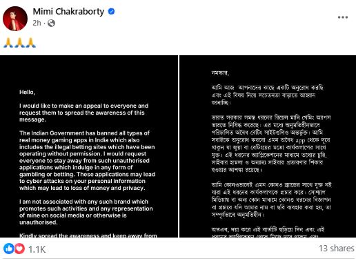 মিমির সংযোজন, “আমি কোনওভাবেই এমন কোনও ব্র্যান্ডের সঙ্গে যুক্ত নই যারা এধরনের কার্যকলাপকে প্রচার করে। সোশাল মিডিয়ায় বা অন্য কোনও মাধ্যমে কোনও ধরনের বিজ্ঞাপন বা প্রচারে যদি আমার নাম বা ছবি ব্যবহার করা হয়, তা সম্পূর্ণভাবে অনুমতিহীন। অতএব দয়া করে এই বার্তাটি ছড়িয়ে দিন এবং এই ধরনের অ্যাপ্লিকেশন থেকে নিজে দূরে থাকুন এবং অন্যকেও সচেতন করুন।” অতঃপর আর কেউ যাতে এই বেটিং অ্যাপগুলির ফাঁদে না পড়েন, সতর্ক করে দিলেন অভিনেত্রী। আবার একাংশের দাবি, যেহেতু অভিনেত্রী তাঁর পোস্টে ‘বিনা অনুমতিতে নাম-ছবি ব্যবহারের’ কথা উল্লেখ করেছেন, সেক্ষেত্রে কি ভুয়ো বিজ্ঞাপনের জন্যই আইনি বিতর্কে জড়িয়েছিলেন মিমি? যদিও তা নিয়ে ধোঁয়াশা রয়েছে। তবে মিমি যে সকলকে সচেতন করতেই এই পোস্ট করেছেন, সেটা স্পষ্ট।