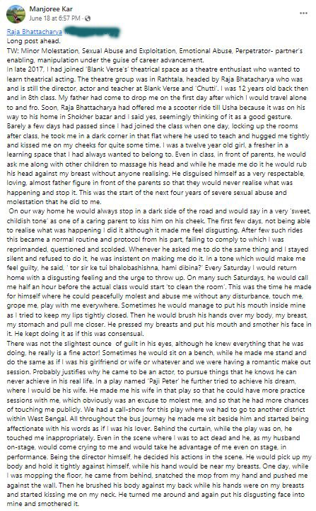 সংবাদ প্রতিদিন ডিজিটাল ডেস্ক: জনপ্রিয় নাট্য ব্যক্তিত্ব রাজা ভট্টাচার্যের বিরুদ্ধে মিটু অভিযোগ আনলেন ১৮ বছর বয়সি এক ছাত্রী। ছাত্রীর অভিযোগ ২০১৭ সালে ‘ব্ল্যাক ভার্স ‘ নামে এক নাটকের দলে অভিনয় শেখার জন্য ভরতি হয়েছিলেন ছাত্রী। সেখানেই রাজা ভট্টাচার্যের হাতে যৌন নিগ্রহের শিকার হন এই ছাত্রী। ফেসবুকে ৬ বছর আগের যন্ত্রণার কথা লিখলেন তিনি। তখন ছিল ১২ বছর বয়স।