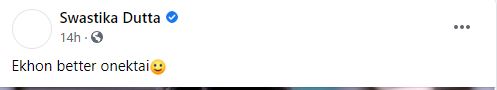 কিন্তু পরের দিনই আবার গুরুত্বপূর্ণ সিক্যুয়েন্স ছিল। তা বাতিল করলে খুব সমস্যা হয়ে যেত। তাই ব্যথা নিয়ে আবার সেটে হাজির হন স্বস্তিকা। গোটা দিন সেভাবেই শুটিং করেন। এবিষয়ে কথা বলতে গিয়ে অভিনেত্রী জানান, পেইন কিলার খেয়েছিলেন তিনি। কিন্তু তা সত্ত্বেও ব্যথা হচ্ছিল। কিন্তু সেদিন শুট না করলে ক্ষতি হয়ে যেত। তার পরের দিন অবশ্য ছুটি পেয়েছিলেন । সেদিনটা সম্পূর্ণ বিশ্রাম নিয়েছেন অভিনেত্রী। সামনেই আবার আউটডোর শুটিং রয়েছে। সেখানেও অনেক গুরুত্বপূর্ণ দৃশ্যের শুটিং করতে হবে। তাই সুস্থ থাকতেই হবে। এখন অনেকটা ভাল আছেন বলেও ফেসবুকে জানিয়েছেন।