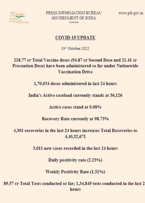 3,011 new Covid19 cases in India today; Active caseload at 36,126.