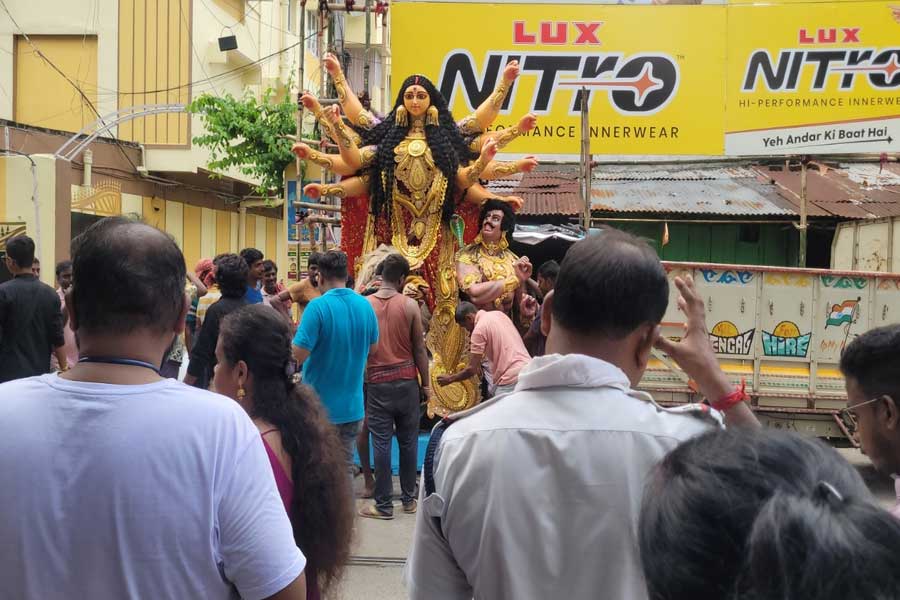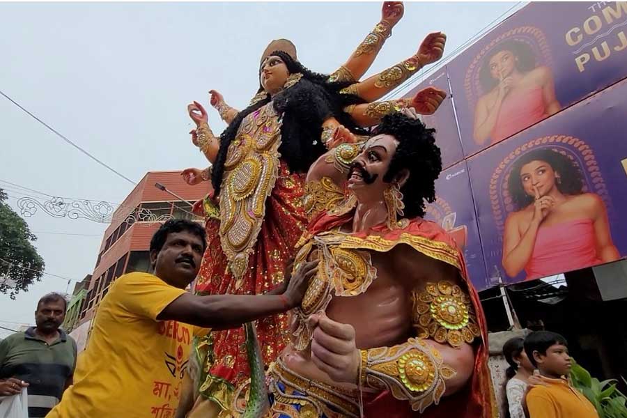 সত্যিই পুজো ভালো কাটে? পরিতোষ শিকারি বলছেন, ‘‘বাড়িতে থাকলেও এই সময়টা আমরা এই কাজ করেই আনন্দ খুঁজি! কষ্ট হয়! রেললাইনের কাছে রান্না করতে হয়। কিন্তু দক্ষিণ ২৪ পরগনার ভিন্ন ভিন্ন জায়গা থেকে এসেও কাজটা করতে চাই রোজ।’’ ওঁরা কাজ করেন। শক্তসমর্থ শরীরেই প্রত্যেক মুহূর্তে সংসার চালানোর তাগিদে জোটবদ্ধ হন ওঁরা। তপ্ত রাস্তায় প্রতিমা বহনে যেন বলে চলেন এগিয়ে যাওয়ার কথাই!
