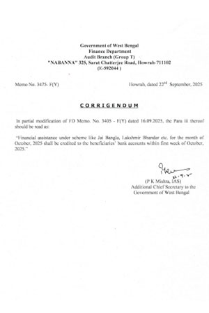 প্রসঙ্গত, ২৬ সেপ্টেম্বর থেকেই পুজোর ছুটি পড়ে যাচ্ছে। চলবে আগামী ৭ অক্টোবর পর্যন্ত। সেই কারণে আগেই মাসের বেতন আগাম মিটিয়ে দেওয়া সিদ্ধান্তের কথা জানিয়েছিল নবান্ন। অন্যদিকে সেপ্টেম্বর মাসের জয় বাংলা, লক্ষ্মীর ভাণ্ডার-সহ বিভিন্ন আর্থিক সহায়তা প্রকল্পের অর্থ উপভোক্তাদের ব্যাঙ্ক অ্যাকাউন্টে ডিবিটি মারফৎ যাবে বলে জানানো হয়। বলা হয়, আগামী ১ অক্টোবর দেওয়া হবে টাকা। এর জন্য বিভিন্ন দপ্তরের ডিডিও এবং অ্যাডমিনিস্ট্রেটরস অফ ডিপোজিট অ্যাকাউন্টসগুলিকে ট্রেজারিতে বিল বা অ্যাডভাইস আগে জমা দিতে নির্দেশও দেয় অর্থদপ্তর।