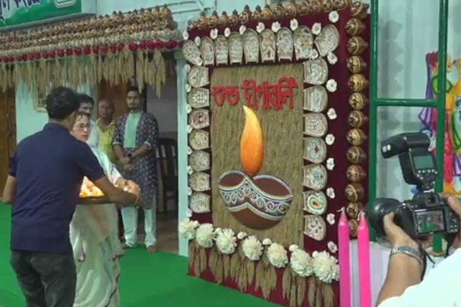 বৃহস্পতিবার সকালে নিজের বাড়ির প্রতিমার ছবি সোশাল মিডিয়ায় পোস্ট করেছিলেন মমতা বন্দ্যোপাধ্যায়। হলুদ-লাল শাড়ি, সোনার গয়না, ঈষৎ নীলচে বর্ণ প্রতিমাকে ‘দিগম্বরী’ রূপে বর্ণনা করেছেন তিনি। বঙ্গবাসীকে শুভেচ্ছাও জানিয়েছেন। আর সন্ধে নাগাদ দেখা গেল কালীঘাটের বাড়িতে কালী আরাধনার ছবি। বাড়ির সামনে লেখা – শুভ দীপাবলি। সেখানে মুখ্যমন্ত্রীর নিজের হাতে আঁকা একটি ছবিও দেখা গেল।