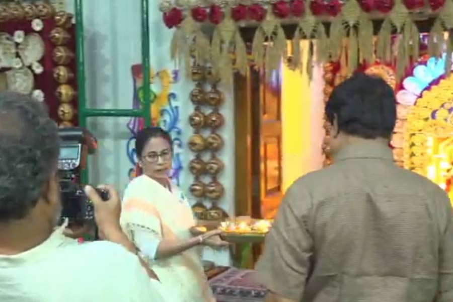 পরনে সরু বেগুনি পাড়ের সাদা শাড়ি, কাঁধে সাদা উত্তরীয়। এমন সাদামাটা গৃহকর্ত্রীর সাজেই কালীপুজোয় দেখা যায় রাজ্যের মুখ্যমন্ত্রীকে। আজও সেই রূপ তাঁর। কিছুক্ষণ পুজোর সাজসজ্জার কাজ দেখলেন মমতা। তার পর চলে গেলেন অন্যদিকে। ততক্ষণে কালীঘাটের বাড়িতে এসে পৌঁছেছেন বিধানসভার স্পিকার বিমান বন্দ্যোপাধ্যায়। তাঁর সঙ্গে কিছুক্ষণ কথা বললেন মুখ্যমন্ত্রী। তার পর থালায় প্রদীপ সাজিয়ে তিনি গেলেন অন্দরমহলে। তিথি মেনে আজ রাতেই তাঁর বাড়িতে কালীপুজো। সন্ধের পর থেকে শুরু হয়ে যাবে ভোগ রান্নার আয়োজন। তাতেও হাত লাগাবেন মুখ্যমন্ত্রী। সেইসঙ্গে বাড়িতে অতিথি-অভ্যাগতদেরও আপ্যায়ণের দায়িত্ব সামলাবেন তিনি নিজে। দিন থেকে রাত, আজকের দিনটা তাঁর ব্যস্ততাতেই কাটছে।