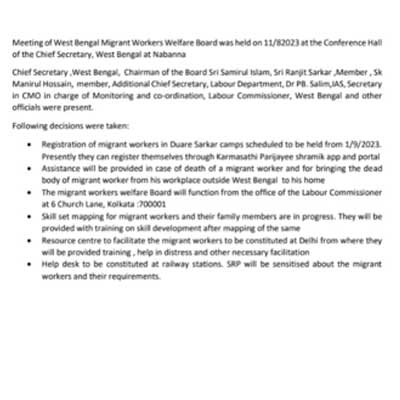 শুক্রবার নবান্নের বৈঠকে রাজ্যের মুখ্যসচিব হরিকৃষ্ণ দ্বিবেদীর উপস্থিতিতে বৈঠক করেন ওয়েস্টবেঙ্গল মাইগ্র্যান্ট ওয়ার্কার্স ওয়েলফেয়ার বোর্ডের চেয়ারম্যান সামিরুল ইসলাম। তিনি বলেন, ‘‘দুয়ারে সরকার প্রকল্পে পরিযায়ী শ্রমিকদের রেজিস্ট্রেশন চালু করা হচ্ছে। যাতে তাঁদের সমস্ত তথ্য সরকারের কাছে থাকে। এছাড়াও এই শ্রমিকদের উন্নতিতে একাধিক পদক্ষেপ নেওয়া হয়েছে।’’