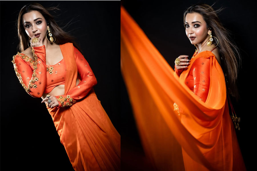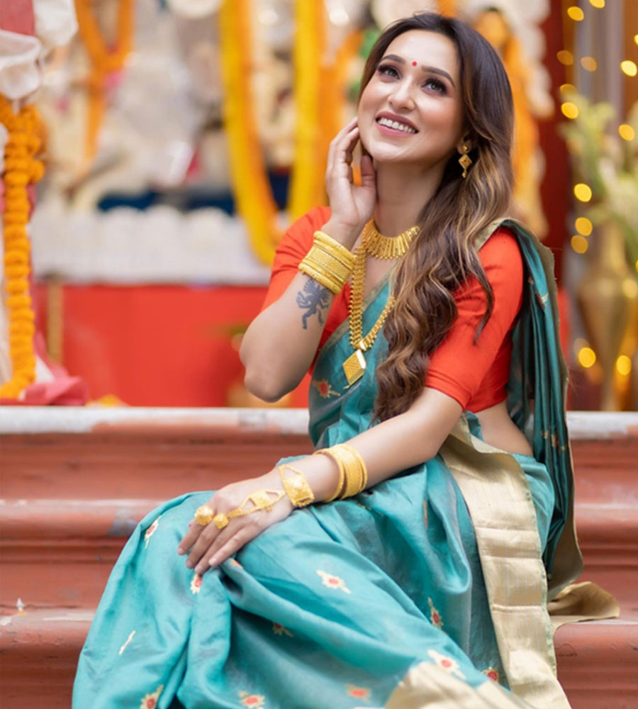 যদি সাবেকি লুকের বদলে জমকালো সাজে সাজতে চান তাহলে চোখ বন্ধ করে ফলো করতে পারেন নায়িকা কৌশানী মুখোপাধ্যায়ের এই লুক। জমকালো কমলা রঙের শাড়ির সঙ্গে জমকালো ব্লাউজ সামান্য গয়না ও মেকআপ। ব্যস আপনার অষ্টমীর সাজ সম্পূর্ণ। যেহেতু শাড়ি ও ব্লাউজ দুইই বেশ ভারি কাজের তাই গয়না বেশি না পরার চেষ্টাই করবেন।