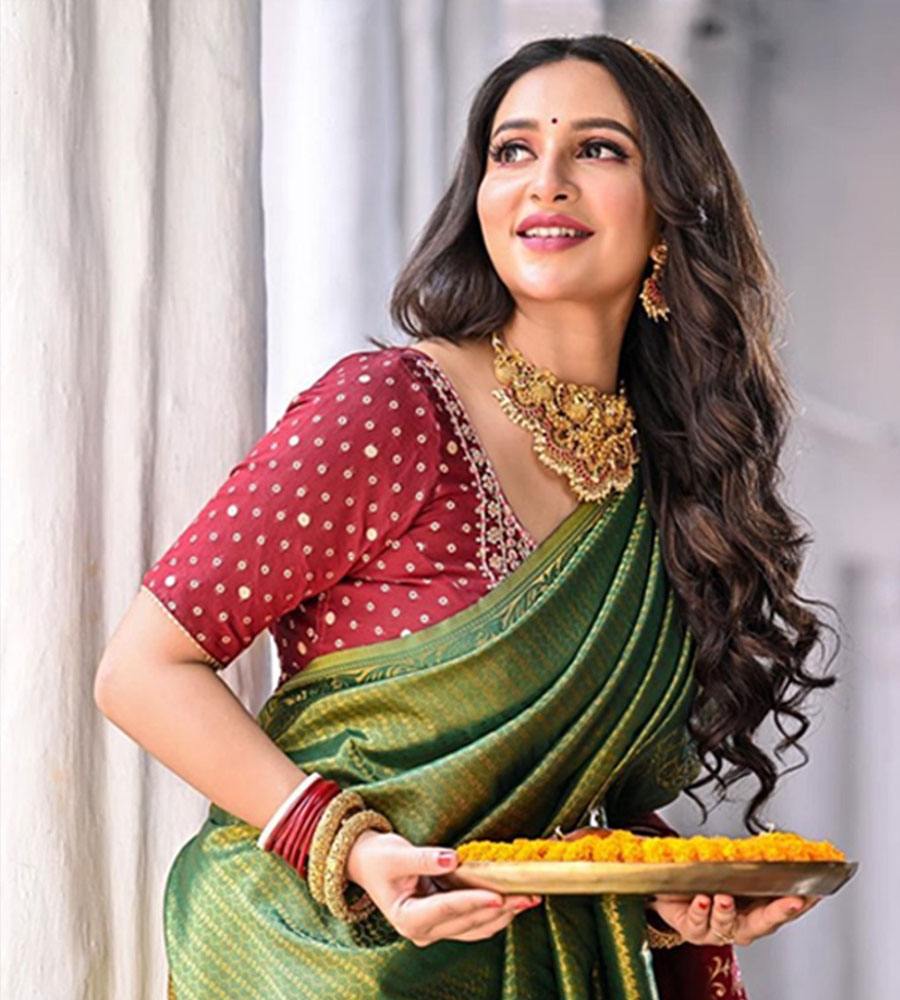 নায়িকা শুভশ্রী গঙ্গোপাধ্যায়, শাড়ি ও সাবেকি সাজে টলিপাড়ার লেডি সুপারস্টার বরাবরই হিট। অষ্টমীর সাজে নায়িকার মতো সেজে উঠতে চাইলে পরতেই পারেন এমন হালকা সিক্যুইনের শাড়ি সঙ্গে ভারি কাজের জমকালো ব্লাউজ, সাবেকি গয়না ও মানানসই মেকআপ, হেয়ারস্টাইল। কপালে ছোট্ট টিপ, আর একগাল হাসি। সবমিলিয়ে আপনার অষ্টমীর সাজ হয়ে উঠবে লাজবাব।