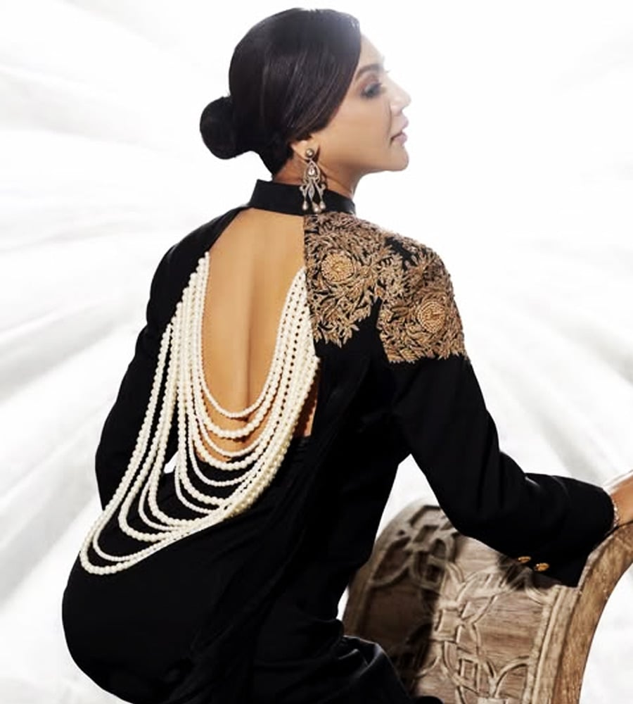 ঐতিহ্যের সঙ্গে পাশ্চাত্যের মেলবন্ধনে এই বিশেষ পোশাক ফ্যাশনের নতুন সংজ্ঞা তৈরি করে। শেরওয়ানি স্টাইলের এই গাউনের বিশেষ আকর্ষণ ব্যাকসাইডের কারুকাজ। কলার দেওয়া শেরওয়ানির পিঠ থেকে কোমর পর্যন্ত উন্মুক্ত। দু’ পাশে ঝুলিয়ে দেওয়া রাশি রাশি মুক্তোর ছড়া যেন জয়ার রূপে অতিরিক্ত ‘ছটা’ যোগ করেছে। যেখান থেকে উঁকি দিচ্ছে জয়ার উন্মুক্ত পিঠ। আর পোশাকের এই ডিজাইনটিতেই আবেদনের মাত্রা যেন চুঁইয়ে চুঁইয়ে পড়ছে! কাঁধজুড়ে জরির সুতোর ভারী কাজ করা।