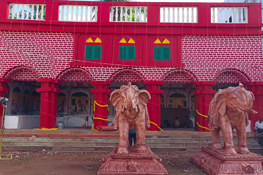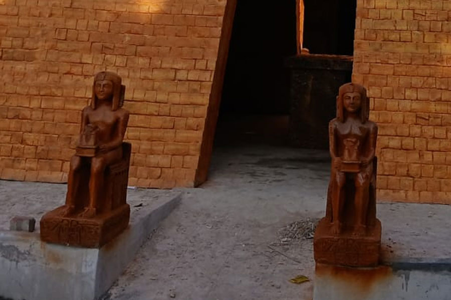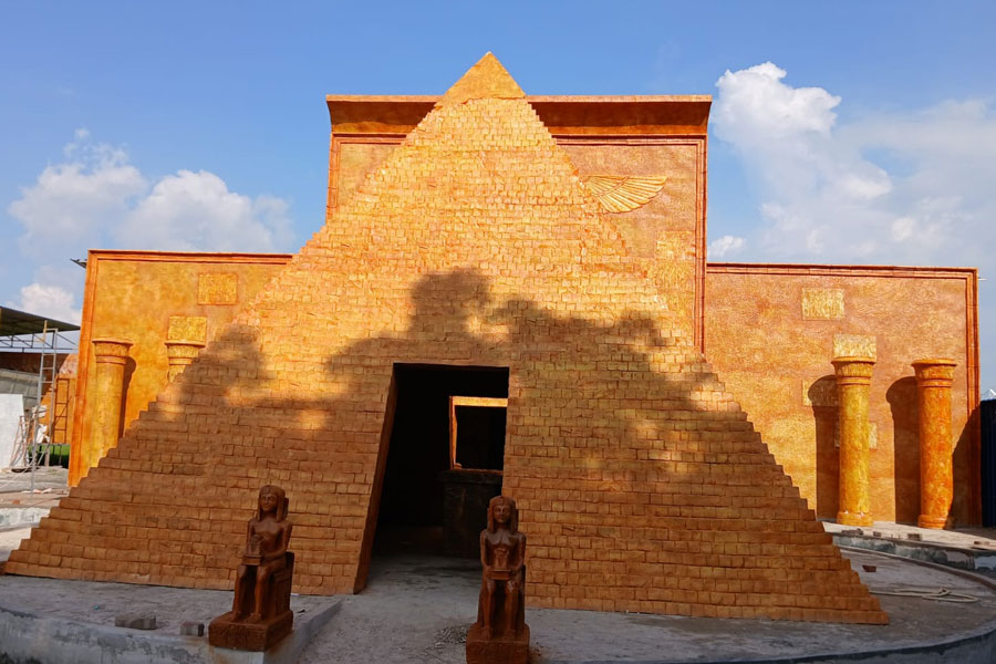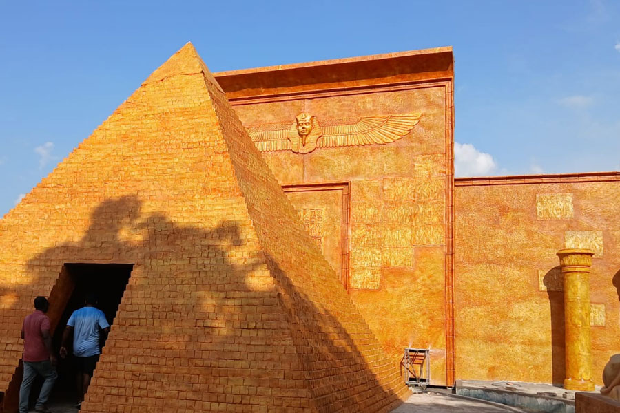 মিশরীয় সভ্যতা বসিরহাটে! সেখানকার ঐতিহ্যবাহী ঘোষবাড়ির দুর্গাপুজোয় গেলে দেখা যাবে এমনই দৃশ্য। পুজোর দিনে লক্ষাধিক মানুষের সমাগম হবে সেখানে। এমনই মত উদ্যোক্তাদের। ছবি: গোবিন্দ রায়