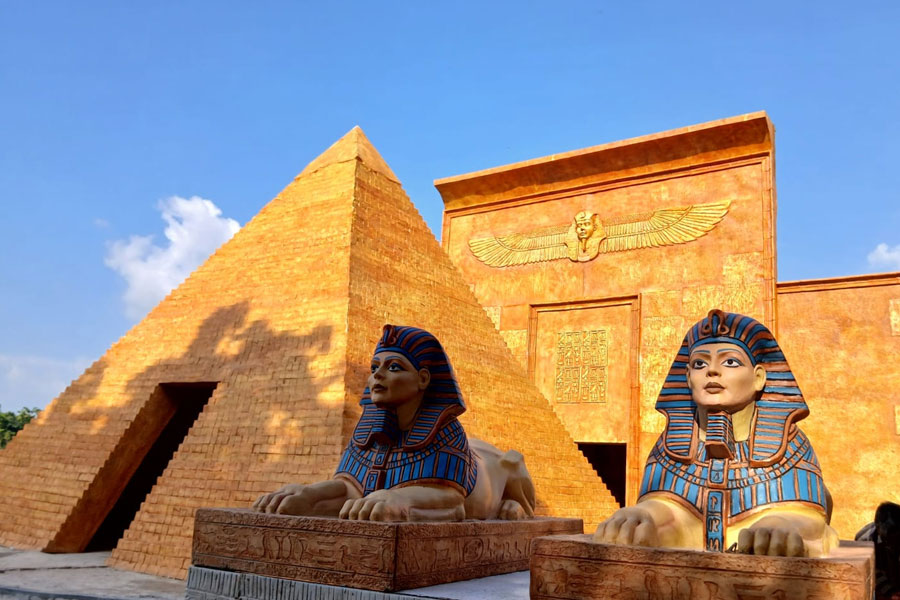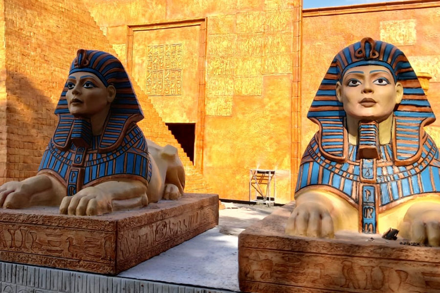 পিরামিড, বালির মরুভূমি, তুতেনখামেন, মমি ও ক্লিওপেট্রা-সহ মিশরীয় সভ্যতার দেখা মিলবে সেই মণ্ডপে। জানা গিয়েছে, মিশরের বিভিন্ন পিরামিড থেকে বেশ কিছু ছবি এবং ভাস্কর্য উদ্ধার করেছিলেন পুরাতত্ত্ববিদরা। তাতে ছিল দুর্গাপ্রতিমার আদল। ছবি: গোবিন্দ রায়