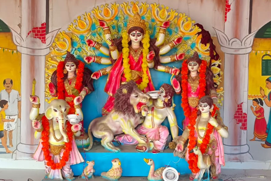 কেবল মিশরীয় সভ্যতার দুর্গাপুজো নয়, একই চত্বরে থাকছে মহিষাদলের রাজবাড়ির অনুকরণে সাবেকি মণ্ডপ। অপরদিকে ঘোষবাড়ির তিনশো বছরের পুরনো বনেদি বাড়ির পুজো। অর্থাৎ একই চত্বরে তিনটি আলাদা দুর্গাপুজোর আসর বসতে চলেছে এই ঘোষবাড়িতে। ছবি: গোবিন্দ রায়