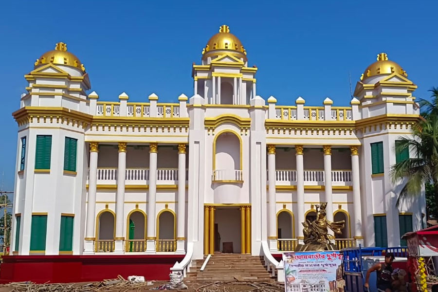 ঘোষবাড়িতে ঢুকলেই দেখা যাবে মহিষাদলের রাজবাড়ি। প্লাই, লোহা ও রং-এর ব্যবহার করে একেবারে হুবহু মহিষাদল রাজবাড়ির আদলে তৈরি হয়েছে পুজো মণ্ডপ। আরেকটু এগোলোই ৩০০ বছরের পুরনো ঘোষবাড়ির নিজস্ব বনেদি পুজো। আর দু'পা হাঁটলেই থাকছে বিশেষ চমক। যেখানে তুলে ধরা হয়েছে মিশরীয় সভ্যতাকে। ছবি: গোবিন্দ রায়
