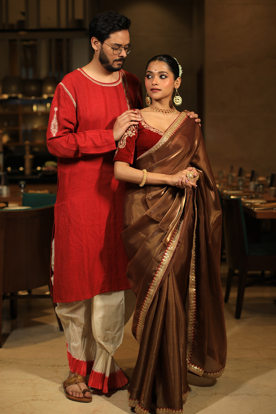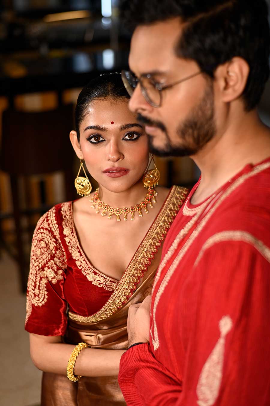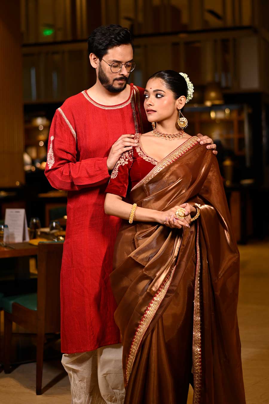 পুজোর সাজে থাকুক আভিজাত্যের ছোঁয়া। রয় ক্যালকাটার পোশাক, জলসাঘরের গয়নায় অনুষা। লাল পাঞ্জাবিতে যোগ্য সঙ্গত আদিত্যর।