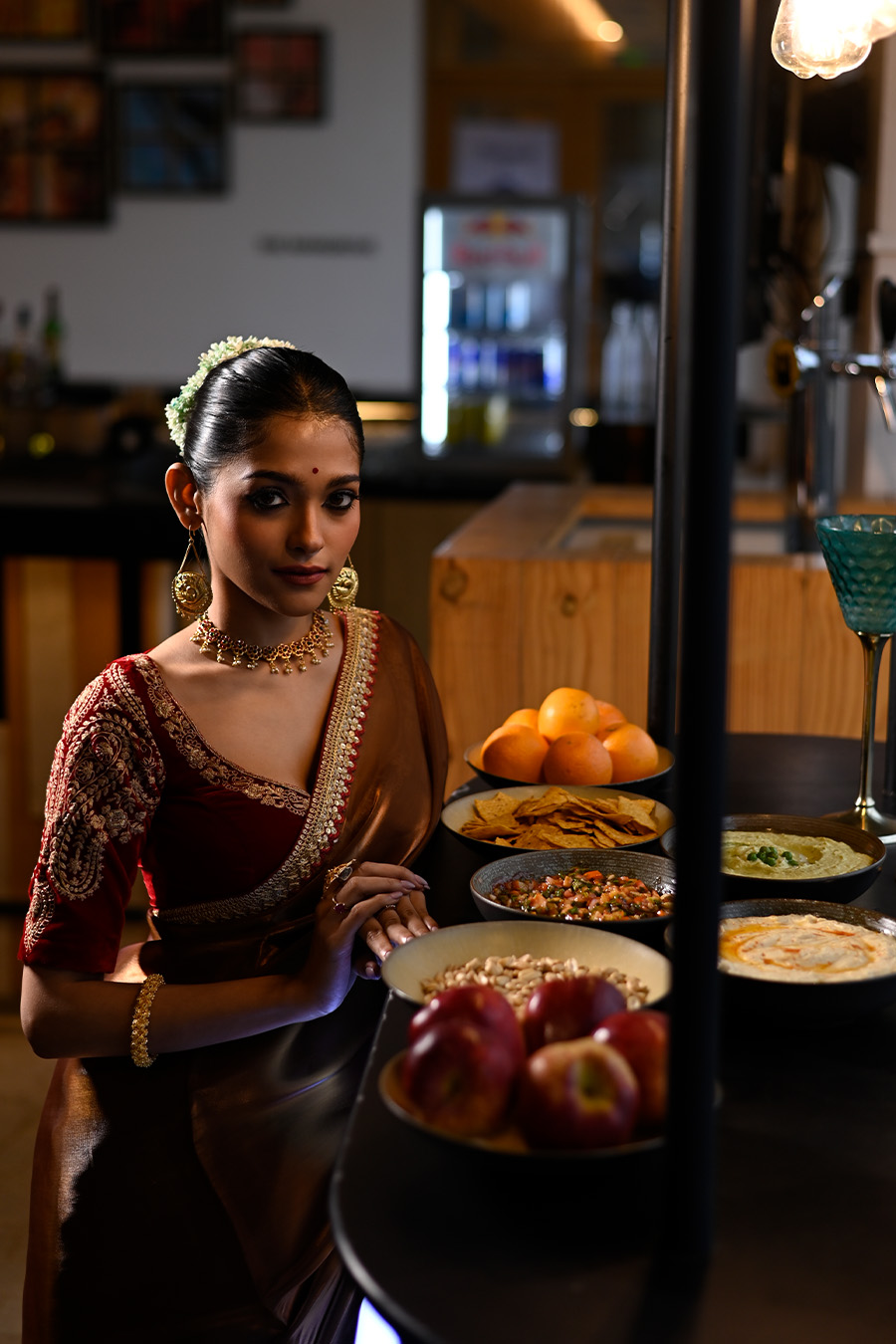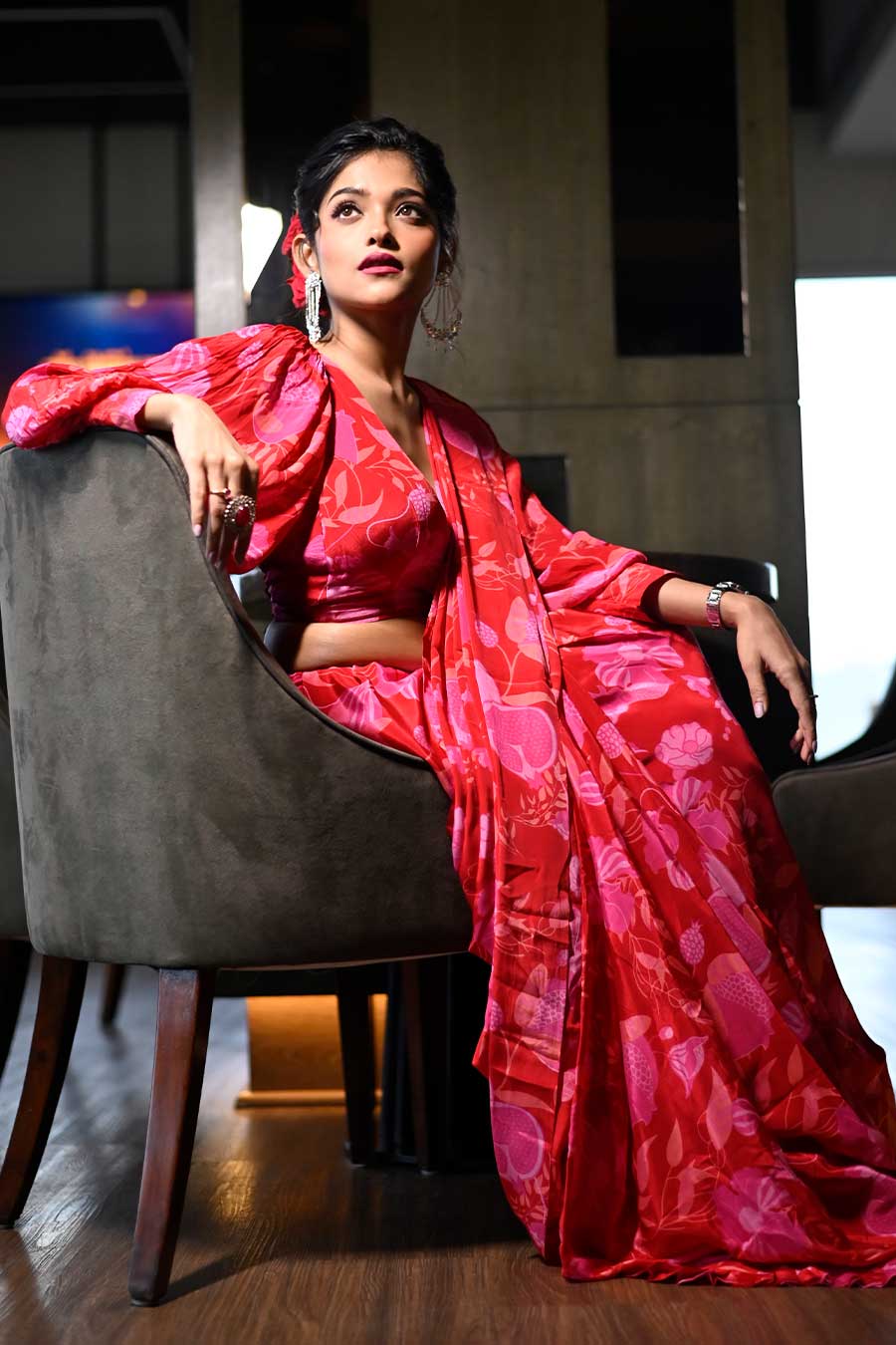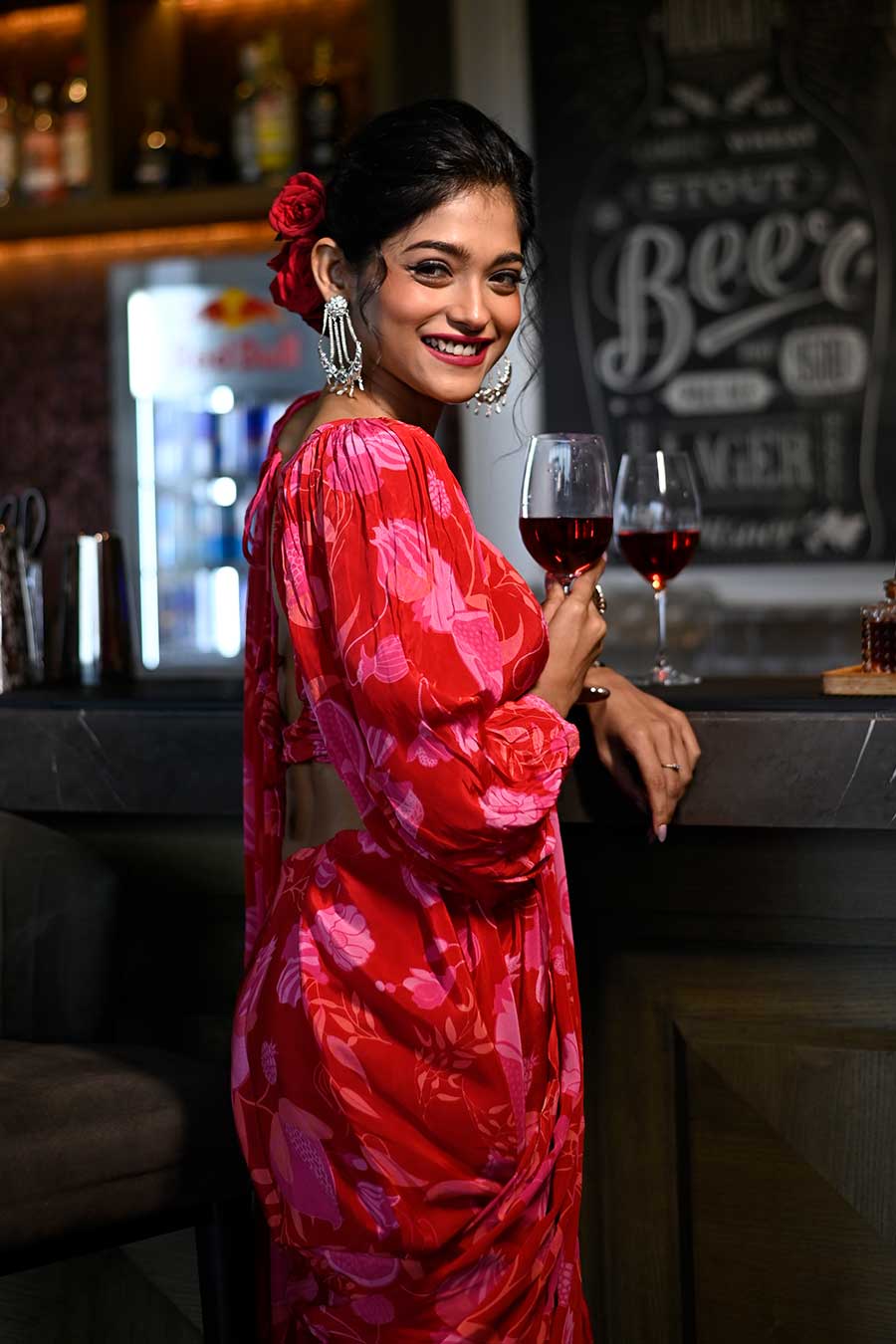 শিফন সিল্কের পপ পিঙ্ক রঙের শাড়ির সঙ্গে বেলুন স্লিভসের ব্লাউজ দারুণ কম্বিনেশন। একটু ওয়াইন, একটু আড্ডা, আর প্রেম... অষ্টমী বা নবমী কিন্তু জমে যাবে।