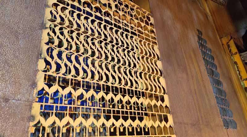 বিশ্বভারতীর কলাভবনের শতবর্ষে শ্রদ্ধার্ঘ হিসাবে এবছর এই ভাবনা শিল্পী পার্থ দাশগুপ্তর। গোটা ভাবনার পিছনে যাঁদের পরিশ্রম রয়েছে তাঁদের মধ্যে মূল হলেন বিশ্বভারতীর প্রাক্তনী পার্থ দাশগুপ্ত এবং কলাভবনের কৃতী ছাত্র তথা বিশ্বভারতীর শিক্ষাসত্রের শিক্ষক সুধীরঞ্জন মুখোপাধ্যায়। সুধীরঞ্জনবাবু দীর্ঘদিন ধরে রবীন্দ্র আলপনা নিয়ে গবেষণা করছেন। বহু আলপনাও তিনি এঁকেছেন। শান্তিনিকেতনের আলপনা দিয়েই এবার মণ্ডপ সাজিয়েছেন দুজনে। গোটা মণ্ডপটাই লোহার শিট দিয়ে তৈরি। তার উপর বিভিন্ন জ্যামিতিক ফর্মেশনে বিভিন্ন কারুকার্য তৈরি করেছেন পার্থবাবু। এখানেই তিনি অনবদ্য। ত্রৈমাত্রিক সেই ফর্মেশনগুলি রয়েছে গোটা মণ্ডপজুড়ে। প্রতিমাতেও আলপনার ছাপ রেখেছেন শিল্পী পার্থ দাশগুপ্ত। মৃন্ময়ী প্রতিমায় থাকছে আলপনার রূপরেখা।