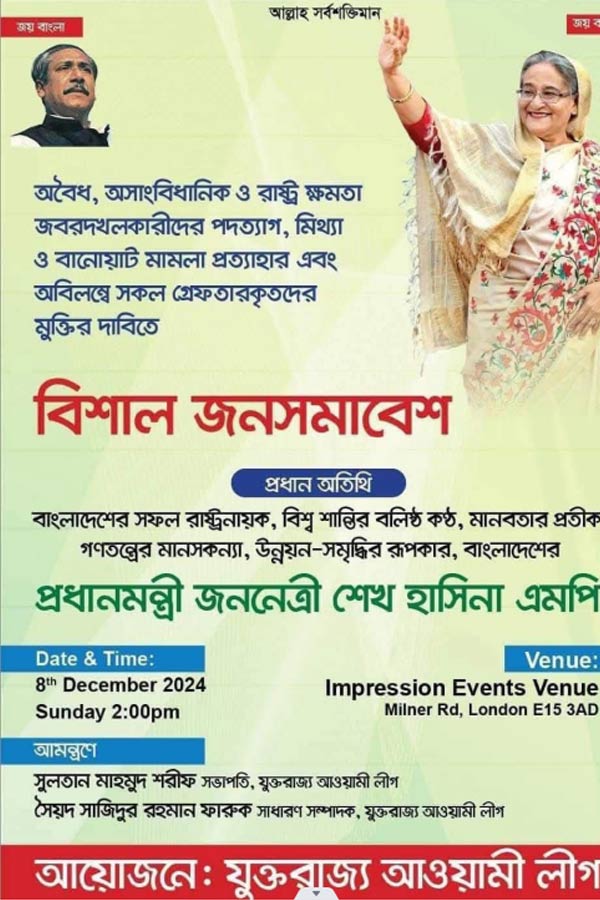 জানা গিয়েছে, রবিবার দুপুরে লন্ডনের মিলনার রোডের এক প্রেক্ষাগৃহে বড়সড় সমাবেশের আয়োজন করেছে আওয়ামি লিগ। দলের সভাপতি ও সাধারণ সম্পাদকের নেতৃত্বে সেই সভার মূল বক্তা শেখ হাসিনা। আরও উল্লেখযোগ্য, অনুষ্ঠানের যে বিজ্ঞপ্তি দেওয়া হয়েছে, তাতে হাসিনাকে গণপ্রজাতন্ত্রী বাংলাদেশের ‘প্রধানমন্ত্রী’ বলেই উল্লেখ করেছে আওয়ামি লিগ! হাসিনা নিজেও অবশ্য একাধিকবার দাবি করেছেন, তিনি প্রধানমন্ত্রী পদ থেকে ইস্তফা দেননি। আওয়ামি লিগও যে নেত্রীকেই প্রধানমন্ত্রী মনে করে ইউনুস সরকারের অস্তিত্ব অস্বীকার করছে, তাও স্পষ্ট হল এই বিজ্ঞপ্তিতে।