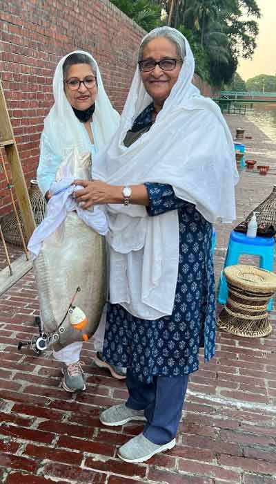 জানা গিয়েছে, শুক্রবার ছিল দেশে সরকারি ছুটির দিন। ওইদিনই ছোট বোন শেখ রেহানাকে নিয়ে সকালে ঢাকার (Dhaka) গণভবনের লেকে তিনি বসে পড়েন মৎস্য শিকারে। শাসকদল আওয়ামি লিগের অফিসিয়াল ফেসবুক থেকে ছোট বোন শেখ রেহানাকে সঙ্গে নিয়ে প্রধানমন্ত্রীর মাছ ধরার তিনটি ছবি পোস্ট করা হয়। শুক্রবার সকালেই ছবিগুলো তোলা হয়। ওই ছবিতে দেখা যায়, প্রধানমন্ত্রী শেখ হাসিনার হাতে মাছ শিকারের বড়শি। তাতে ধরা পড়েছে বড় আকারের একটি চিতল মাছ। সেই মাছ বড়শি থেকে ছাড়াচ্ছেন বঙ্গবন্ধুকন্যা শেখ হাসিনা ও তার ছোট বোন শেখ রেহানা।