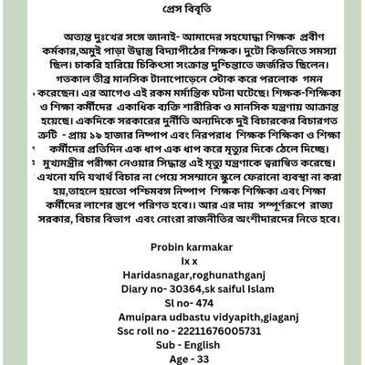 জানা গিয়েছে, মৃত শিক্ষকের নাম প্রবীণ কর্মকার। মুর্শিদাবাদের রঘুনাথগঞ্জের হরিদাসনগরের বাসিন্দা তিনি। ২০১৬ সালের এসএসসি-তে চাকরি পান তিনি। অমুইপাড়া উদ্বাস্তু বিদ্যাপীঠের শিক্ষক ছিলেন তিনি। বছর তিনেক আগে আচমকা অসুস্থ হয়ে পড়েন। একাধিক পরীক্ষা করা হয়। ধরা পড়ে কিডনির সমস্যা। শুরু হয় ডায়ালিসিস। এরই মাঝে সুপ্রিম রায়ে চাকরি হারিয়েছেন প্রায় ২৬ হাজার শিক্ষক ও অশিক্ষক কর্মী। সেই তালিকায় নাম ছিল প্রবীণেরও। চাকরি হারানোয় স্বাভাবিকভাবেই মানসিকচাপ ছিলই। এরই মাঝে বুধবার গভীর রাতে মৃত্যু হয় প্রবীরবাবুর। প্রাথমিকভাবে জানা যাচ্ছে, ব্রেন স্ট্রোকে মৃত্য হয়েছে শিক্ষকের। ইতিমধ্যেই চাকরিহারাদের তরফে মৃত্যুর বিষয়টা নিশ্চিত করেছেন আন্দোলনরত চাকরিহারারা।