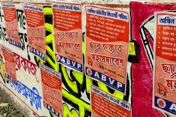 সুরজিৎ দেব, ডায়মন্ড হারবার: ব্রিগেড সমাবেশের সমর্থনে সিপিএম (CPM) পার্টি অফিসে দেওয়াল লিখন। কিন্তু বার্তা পড়ার উপায় নেই। কারণ, সেই লেখার উপর বিজেপির ছাত্র সংগঠন এবিভিপির (ABVP) দলীয় কর্মসূচির ভরতি পোস্টার মারা। ঘটনা ঘিরে শনিবার বিকেলে রাজনৈতিক উত্তেজনা ছড়াল দক্ষিণ চব্বিশ পরগনার ডায়মন্ড হারবার পুর এলাকায়। এ নিয়ে সিপিএম ও বিজেপি কর্মীদের বচসাও হয়। এরপর সিপিএম কর্মী, সমর্থকরা পথ অবরোধে নামেন।