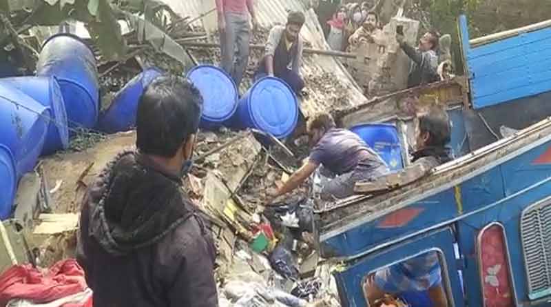 জানা গিয়েছে, রবিবার সকালে কলকাতা থেকে ট্রাকটি যাচ্ছি বনগাঁর (Bangaon) দিকে। কেমিক্যাল ভরতি ওই ট্রাকটির গন্তব্য ছিল বাংলাদেশ। অশোকনগরের ৩ নম্বর রেলগেট সংলগ্ন এলাকায় আচমকাই নিয়ন্ত্রণ হারিয়ে উলটে যায় ট্রাকটি। শব্দ পেয়ে স্থানীয়রা ছুটে গিয়ে দেখেন, নয়ানজুলিতে উলটে গিয়েছে ট্রাক। ছড়িয়ে ছিটিয়ে রয়েছে কেমিক্যালের ড্রাম। সঙ্গে সঙ্গে খবর দেওয়া হয় থানায়। প্রাথমিকভাবে স্থানীয়রাই উদ্ধার কাজ শুরুর চেষ্টা করে। কিছুক্ষণের মধ্যেই ঘটনাস্থলে পৌঁছয় পুলিশ। ট্রাকে আটকে পড়া চালক ও খালাসিকে উদ্ধার করতে রীতিমতো বেগ পেতে হয় উদ্ধারকারীদের। প্রায় চার ঘণ্টার চেষ্টায় শেষমেশ রক্তাক্ত অবস্থায় বের করা হয় ওই দু’জনের দেহ। সূত্রের খবর, মৃতেরা বনগাঁর বাসিন্দা।