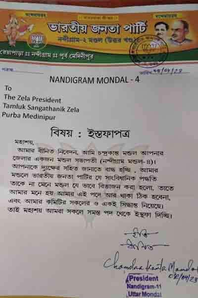 চঞ্চল প্রধান, হলদিয়া: শুভেন্দু অধিকারীর বিরুদ্ধে ক্ষোভ উগরে ইস্তফা দিলেন বিজেপির নন্দীগ্রাম মণ্ডল-৪ সভাপতি চন্দ্রকান্ত মণ্ডল। শনিবার দলের তমলুক সাংগঠনিক জেলা সভাপতির উদ্দেশ্যে লেখা সেই ইস্তফাপত্র তিনি ইমেল করে পাঠিয়েও দিয়েছেন। সেই সঙ্গে রাজ্য সভাপতি সুকান্ত মজুমদারকে বিষয়টি জানাতে ইমেল করেছেন। নন্দীগ্রাম ১ নম্বর ব্লকের পর নন্দীগ্রাম ২ নম্বর ব্লকে ফের বিজেপির ঘর ভাঙল। যা দেখে আলোড়ন পড়েছে রাজনৈতিক মহলে।