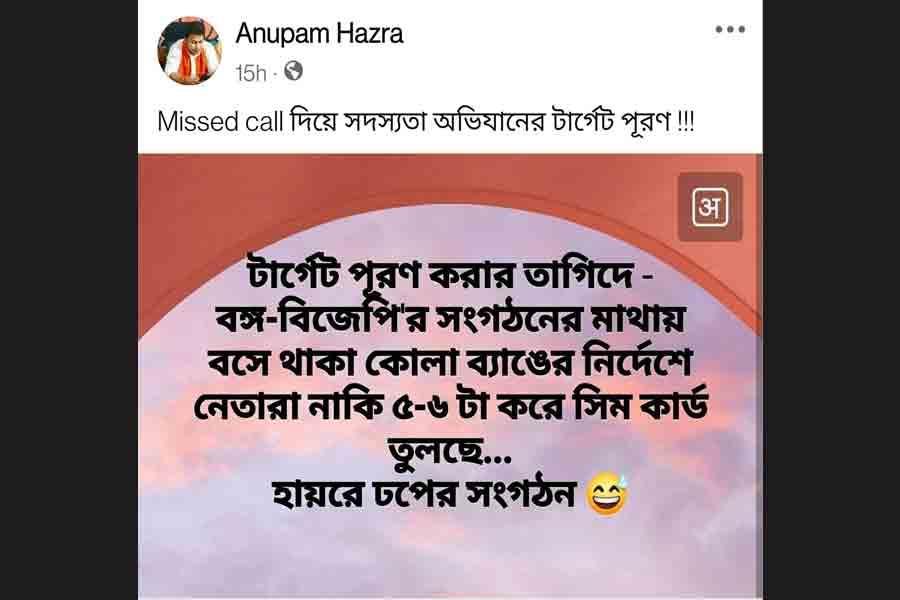 দেব গোস্বামী, বোলপুর: এমনিতেই দলের কেন্দ্রীয় নেতৃত্বের বেঁধে দেওয়া সময়ের মধ্যে নির্ধারিত সদস্য সংখ্যা সংগ্রহ করতে কালঘাম ছুটছে বঙ্গ বিজেপি নেতৃত্বের। এবার কাটা ঘায়ে নুনের ছিটে দিলেন বোলপুরের বিজেপি নেতা অনুপম হাজরা। মিসড কল দিয়ে বিজেপির সদস্যপদ সংগ্রহ অভিযানের টার্গেট পূরণ নিয়ে সোশাল মিডিয়ায় শ্লেষ উগড়ে দিলেন।