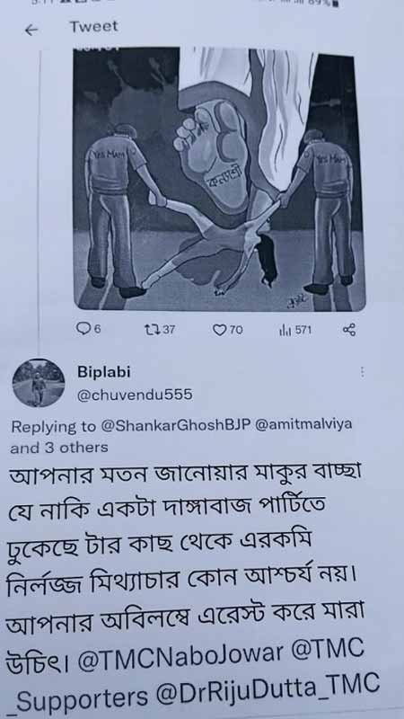 কয়েকদিন আগে শিলিগুড়ির (Siliguri) বিধায়ক কালিয়াগঞ্জের ঘটনা নিয়ে টুইট করেছিলেন। সেখানে ‘বিপ্লবী’ বলে এক ব্যক্তির প্রোফাইল থেকে শংকর ঘোষের ওই টুইটে কমেন্ট করা হয়েছে। তাতে শেষ লাইনে লেখা ছিল, ”আপনাকে অ্যারেস্ট করে গুলি করে মারা উচিত।” যদিও বিধায়ক নিজে এই কমেন্ট দেখেননি। দলের লোকজন তা দেখতে পেয়ে শংকর ঘোষকে (Shankar Ghosh) জানান। তিনি অবশ্য শুক্রবার বিজেপির ডাকা বন্ধ পালনে ব্যস্ত ছিলেন। তাই শনিবার সকালে তিনি এই কমেন্ট পড়েন।