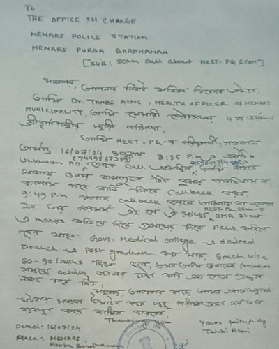 এসব শুনে যদিও চিকিৎসক (Doctor) তানভি আজমি প্রস্তাব নাকচ করে দিয়েছেন। তিনি সাফ জানিয়েছেন, মধ্যবিত্ত পরিবারের মেয়ে। মা-বাবার অসুস্থ। তাঁদের দায়িত্ব নিতে হয়। ফলে NEET-PGতে ভালো র্যাঙ্কের জন্য এই মুহূর্তে এত টাকা তাঁর পক্ষে দেওয়া সম্ভব নয়। তখন আবার তাঁকে সমঝোতার (Negotiation) কথাও বলা হয়। ওই ব্যক্তি জানতে চান, কত টাকা দিতে পারবেন। যদি কিছু কম দেন, তাহলেও হবে। এই প্রস্তাবও অবশ্য খারিজ করেছেন তানভি। স্পষ্ট জানান, তিনি কোনও অর্থই দিতে পারবেন না। এই ফোন পাওয়ার পরই অবশ্য মেমারির (Memari) স্বাস্থ্য আধিকারিক তানভি আজমি মেমারি থানায় লিখিত অভিযোগ জানিয়েছেন।