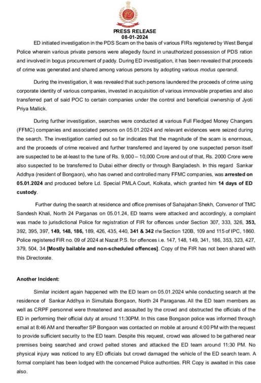 সন্দেশখালি ও বনগাঁয় ইডির উপর আক্রমণের ঘটনার নিন্দা করেও তৃণমূলের মুখপাত্র কুণাল ঘোষ প্রশ্ন তুলেছিলেন, জেলা প্রশাসনকে না জানিয়ে ইডি আধিকারিকরা কেন তল্লাশি চালাতে গিয়েছিলেন? সোমবার ইডি বিবৃতি জারি করে জানায়, বনগাঁয় অভিযানের দিন পুলিশ সুপারকে জানানো হয়েছিল সকালে, বলা হয়েছিল নিরাপত্তা দেওয়ার কথাও। কিন্তু পুলিশ প্রশাসনের তরফে কেউ তাঁদের সঙ্গে যোগাযোগ করেনি। আর রাতের বেলা ইডির গাড়িতে হামলা চলে। কেন্দ্রীয় তদন্তকারী সংস্থা এ বিষয়ে জেলা পুলিশের জবাব চেয়েছে।