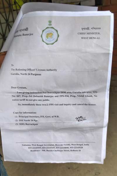 জানা গিয়েছে, বারাকপুর এলাকার রেশন দোকানগুলির লাইসেন্স দেওয়া হয় যে অফিস থেকে সম্প্রতি সেখানে একটি চিঠি যায়। মুখ্যমন্ত্রীর প্যাডে লেখা সেই চিঠিতে শ্যামনগরের দেবাশিস ঘোষ ও নিখিল বন্দ্যোপাধ্যায়ের রেশন দোকান জরুরী ভিত্তিতে সাসপেন্ড করার নির্দেশ দেওয়া হয়। সেই চিঠি পেয়ে ভিজিলেন্স ডিপার্টমেন্টের আধিকারিকদের তরফে রেশন দোকানে যোগাযোগ করা হয়। এই ঘটনায় স্বাভাবিকভাবেই ঘুম ওড়ে রেশন ডিলারদের।