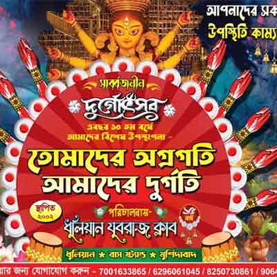 বেশ কয়েকবছর ধরেই দুর্গাপুজোর আয়োজন করছে মুর্শিদাবাদের যুবরাজ ক্লাব। পুজো মণ্ডপ সাজিয়ে তুলছেন বাপ্পা ভৌমিক। মণ্ডপে দেখা যাবে, বাবুই, কোকিল, চড়ুই, বক, কাক, পায়রা-সহ শতাধিক প্রজাতির বিভিন্ন পাখি। পাশাপাশি থাকবে ৪ জি টাওয়ার, ডিস অ্যান্টেনা। ইলেক্ট্রোম্যাগনেটিক তরঙ্গ দ্বারা কীভাবে পাখিরা মৃত্যুর দিকে এগিয়ে যাচ্ছে তা তুলে ধরা হবে মণ্ডপে। এবার তাঁদের বাজেট ৩ লক্ষ ২০ হাজার টাকা।