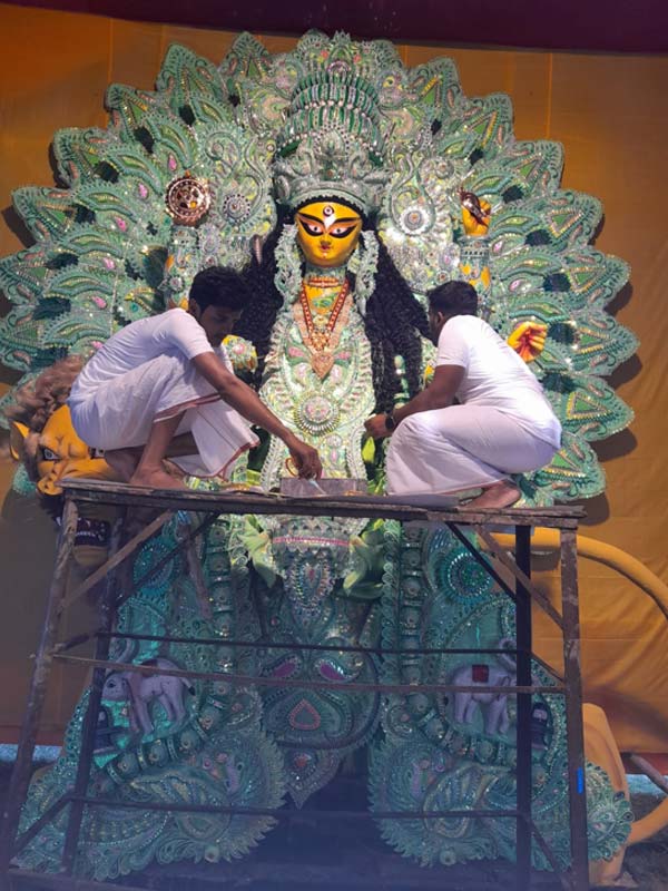 কৃষ্ণনগরের (Krishnanagar) রাধানগরের ক্লাব প্রতিভা। এবছর তাদের পুজো ৪৩ বছরে পা রাখল। জগদ্ধাত্রী পুজোর বাজেট মোট ১৩ লক্ষ টাকা। তার মধ্যে সাত লক্ষ টাকা প্রতিমা নির্মাণেই খরচ হয়েছে তাদের। বলা হচ্ছে, এটাই সবচেয়ে বড় জগদ্ধাত্রী প্রতিমা। ৬০ ফুট দীর্ঘ একটি কদমগাছ নিয়ে আসা হয়েছিল প্রতিমা তৈরির জন্য। সেই কাঠামো ধরেই তা গত ২ মাস নির্মাণ করা হয়েছে। শিল্পী রমেশ পালের তত্বাবধানে প্রতিমার অবয়ব দিয়েছেন ২০ জন শিল্পী। প্রতিমাকে সাজানোর শেষ কাজ চলছে।