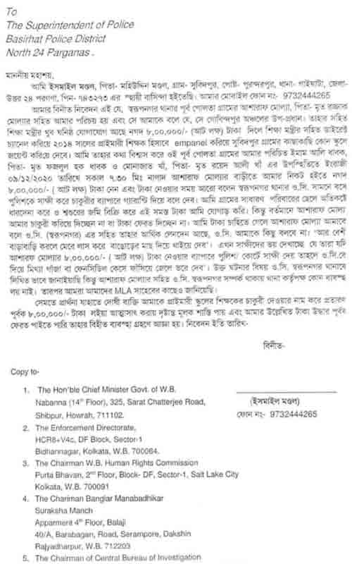 ইসমাইল গাইঘাটা থানার সুবিদপুরের বাসিন্দা। পেশায় গৃহশিক্ষক। ২০১৪ সালে প্রাথমিক টেটে উত্তীর্ণ হন তিনি। ২০১৬ সালে ইন্টারভিউ দিয়েও চাকরি পাননি। ইতিমধ্যে তাঁর শ্বশুরের প্রতিবেশী তৃণমূলকর্মী মোনাজাত খানের সঙ্গে পরিচয় হয় ইসমাইলের। অভিযোগ, মোনাজাত ইসমাইলকে বলেছিলেন ৮ লক্ষ টাকা দিলে প্রাথমিকে শিক্ষকের চাকরি নিশ্চিত। গোবিন্দপুর পঞ্চায়েতের উপপ্রধান আশারফ মোল্লার অতি ঘনিষ্ঠ বলে দাবি করেন তৃণমূলকর্মী মোনাজাত।