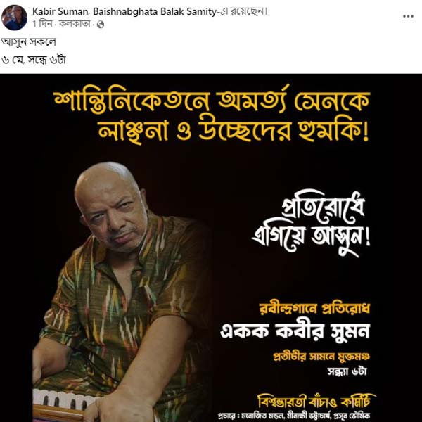 তাঁর নির্দেশে দলের জনপ্রতিনিধিরা অমর্ত্য সেনকে হেনস্তার প্রতিবাদে অবস্থান বিক্ষোভের পাশাপাশি বিশ্বভারতী বাঁচাও কমিটিও আসরে নেমেছে। ৬ মে শান্তিনিকেতনে তাঁর বাড়ি ‘প্রতীচী’র সামনে অমর্ত্য সেনকে ‘লাঞ্ছনা’ ও হেনস্তার প্রতিবাদে ধরনায় বসছেন সমাজের বিশিষ্টজনেরা। অংশ নেবেন চিত্রশিল্পী শুভাপ্রসন্ন, যোগেন চৌধুরী, গায়ক কবীর সুমন, চলচ্চিত্র পরিচালক গৌতম ঘোষ-সহ অন্যান্যরা। কবীর সুমন (Kabir Suman)প্রতীচীর সামনে মুক্তমঞ্চে প্রতিবাদ স্বরূপ একক রবীন্দ্রসংগীত পরিবেশন করবেন। ওইদিন সন্ধে ৬টায় ‘রবীন্দ্রগানে প্রতিরোধ’-এ শামিল হতে সকলকে আহ্বান জানিয়েছেন তিনি। নিজের ফেসবুক পোস্টে তিনি এই ঘোষণা করেছেন।