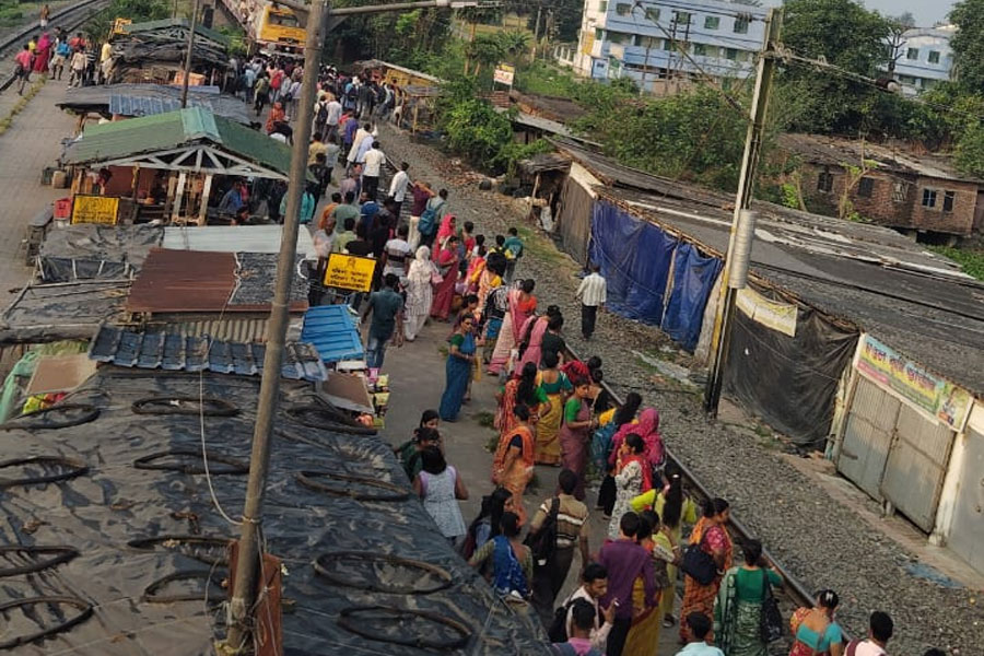 শিয়ালদহ দক্ষিণ শাখায় রেল অবরোধ। ছবি: বিশ্বজিৎ নস্কর