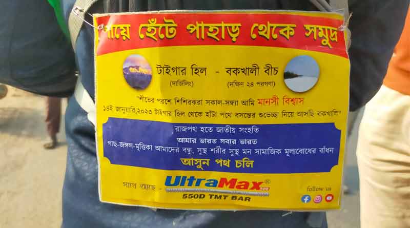 জানা গিয়েছে, ওই তরুণীর নাম মানসী বিশ্বাস। মালদহ জেলার বাসিন্দা তিনি। পেশা হিসেবে কনস্ট্রাকশানের কাজের সঙ্গে যুক্ত তিনি। একের পর এক ভয়াবহ ধস তাঁকে নাড়া দিয়েছিল। তাই গাছ কাটার বিরুদ্ধে সকলকে সচেতন করার সিদ্ধান্ত নেন তিনি। এরপরই ঠিক করেন পায়ে হেঁটে টাইগার হিল থেকে বকখালি অর্থাৎ পাহাড় থেকে সমু্দ্রে আসবেন তিনি। সকলকে বার্তা দেবেন গাছ না কাটার, নতুন গাছ লাগানোর। যেমন ভাবনা তেমন কাজ। ১৪ জানয়ারি টাইগার হিল থেকে যাত্রা শুরু করেন মানসী।