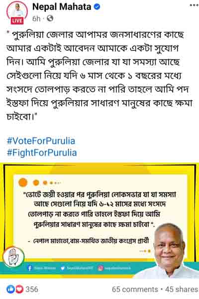 পুরুলিয়ায় ভোটের এক মাসেরও বেশি সময় আগে পুরুলিয়ার রাজনীতির অন্যতম ‘মহারথী’ নেপাল মাহাতোর এমন আবেগতাড়িত পোস্ট নাড়িয়ে দিয়েছে সাবেক মানভূমের রুখা ভূমিকে। এই পোস্টে জঙ্গলমহলের রাজনৈতিক মহলে জল্পনার শেষ নেই। তাহলে কি বিজেপি, তৃণমূল ছেড়ে ‘ইস বার নেপাল মাহাতো?’ সামাজিক মাধ্যমের ওই পোস্টেই জেলার আবেগকে ৪ বারের বিধায়ক আরও উসকে দিয়েছেন ‘ভোট ফর পুরুলিয়া’, ‘ফাইট ফর পুরুলিয়া’ হ্যাশ ট্যাগ দিয়ে। আসলে ‘ফাইট ফর পুরুলিয়া’-র স্লোগান যে তাঁর বাবা, প্রয়াত সাংসদ দেবেন্দ্রনাথ মাহাতোর। যা সাতের দশকে মাত করে দেয় এই মানভূমে। বাবার সেই হিট স্লোগানকেই প্রায় ৫০ বছর পর আবার ভোটের ময়দানে ফিরিয়ে আনলেন নেপাল। আর তাতে যেমন কমেন্ট হচ্ছে। তেমনই হচ্ছে শেয়ার, লাইক। ফেসবুকে লেখা চলছে ‘এবার নেপাল মাহাতো’। ‘ইস বার নেপাল মাহাতো’! কিন্তু তাঁর প্রতিদ্বন্দ্বীরা তুমুল সমালোচনা করছেন। তৃণমূল প্রার্থী শান্তিরাম মাহাতো বলেন, “দেখুন, ভোট চাইতে প্রার্থীরা তো এমন আবেদন করতেই পারেন। কিন্তু মানুষ বিচার করবেন। উন্নয়নের সঙ্গে থাকবেন। নাকি প্রতিশ্রুতিতে।” বিজেপি প্রার্থী জ্যোতির্ময় সিং মাহাতোর কথায়,”বাংলা থেকে কংগ্রেস অনেক আগেই মুছে গিয়েছে। এবার সারা দেশ থেকে মুছে যাবে। নেপালবাবু আমাদের চার বারের বিধায়ক ছিলেন। মানুষ ওনাকে প্রত্যাখ্যান করেছেন।”