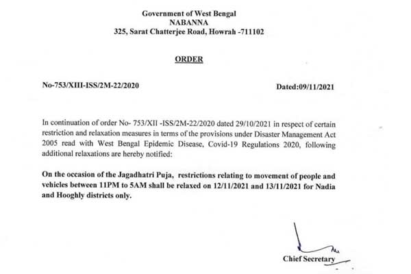 অক্টোবরের শেষে রাজ্যে কোভিডবিধির সময়সীমা বাড়ানোর সময়ই নবান্নের বিজ্ঞপ্তিতে জানানো হয়েছিল, ১০ ও ১১ নভেম্বর ছটপুজোর (Chhat puja) জন্য রাজ্যে রাত্রিকালীন বিধিনিষেধে ছাড় থাকবে। অর্থাৎ রাত ১১ টা থেকে ভোর ৫টা পর্যন্ত বাইরে না বেরনোর নিয়ম শিথিল করা হয়েছিল। ছটের ঠিক পর জগদ্ধাত্রী পুজো উপলক্ষেও এই ছাড় মিলবে কি না, তা জানতে আগ্রহী ছিলেন পুজো উদ্যোক্তা থেকে দর্শনার্থী – সকলেই। মঙ্গলবার নবান্নের নতুন বিজ্ঞপ্তিতে সেই উত্তর মিলল। তবে গোটা রাজ্যে নয়, চন্দননগর ও নদিয়া অর্থাৎ যে এলাকা জগদ্ধাত্রী পুজোর জন্য বিখ্যাত, সেসব জায়গায় শিথিল রাত্রিকালীন বিধিনিষেধ।