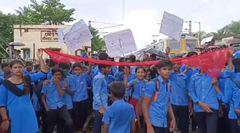 জানা গিয়েছে, বিক্ষোভকারী পড়ুয়ারা ক্যানিংয়ের (Canning) গৌরদহ নারায়ণপুর অক্ষয় বিদ্যামন্দিরের পড়ুয়া। সম্প্রতি ওই স্কুলের মোট ৫ জন শিক্ষক-শিক্ষিকাকে বদলির সিদ্ধান্ত প্রকাশ্যে আসে। তারপরই ক্ষোভে ফেটে পড়ে পড়ুয়ারা। মঙ্গলবার সকালে স্কুলের পোশাকে বিক্ষোভে শামিল হয় কয়েকশো ছাত্র-ছাত্রীরা। গৌরদহ স্টেশনে রেল অবরোধ করে। তাদের দাবি, একসঙ্গে পাঁচজন শিক্ষক-শিক্ষিকাকে বদলির সিদ্ধান্ত প্রত্যাহার করতে হবে। নাহলে রেল অবরোধ চলবে। ঘটনাকে কেন্দ্র করে উত্তপ্ত হয়ে ওঠে স্টেশন চত্বর। গৌরদহ স্টেশন থেকে আপ ও ডাউনে ব্যহত হয় ট্রেন চলাচল।